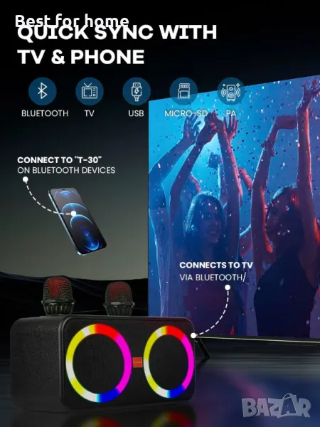【Преносима и с дълъг живот на батерията】Караоке машината е голям високоговорител, който се свързва към вашия смартфон чрез Bluetooth и възпроизвежда музика през вашия мобилен телефон. Алтернативно, високоговорителят също има Aux и USB връзка и може да постави SD карта. Колонката има акумулаторна батерия, така че може да работи без кабели, което е идеално за партита на открито.