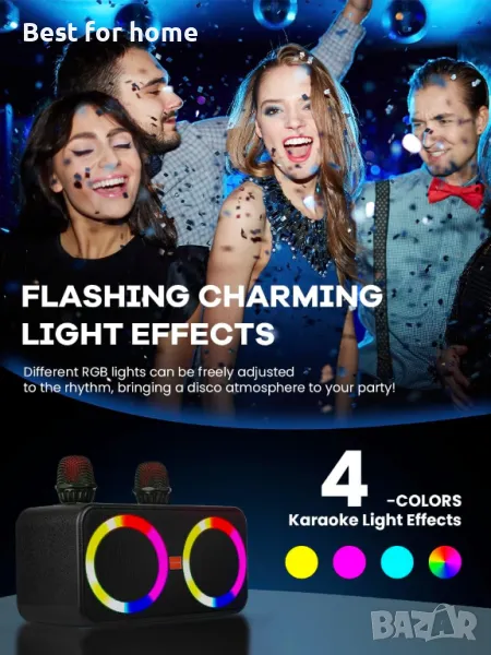 【Цветни LED светлини】 Продуктът разполага със светлинен ефект, който създава празнична атмосфера по време на караоке. Светлините променят цвета си и се синхронизират с музиката, създавайки забавна и увлекателна атмосфера. Страхотен за различни събития и е чудесен подарък.