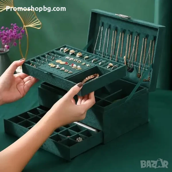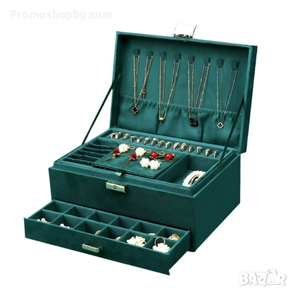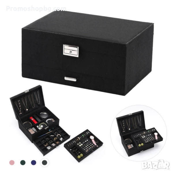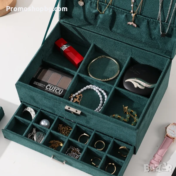 Кутията за бижута ви позволява да организирате ефективно колекцията си. Разполага с различни размери отделения и джобове, което улеснява съхраняването на всички видове бижута, като пръстени, колиета, гривни, часовници, обеци и т.н.