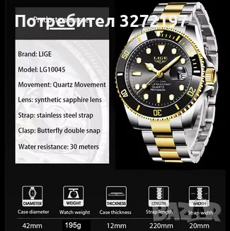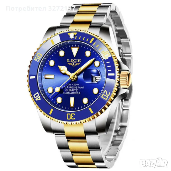 LIGE (Submarine) кварцов часовник с японски механизъм,синтетичен сапфир,водоустойчив,керамичен безел