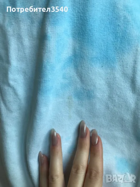 Има 2 петна - едно отпред и едно на ръкава (показани на снимките). Давам и допълнителни снимки, защото качеството се нарушава при качване.