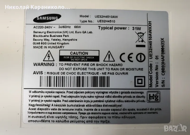 Продавам тв SAMSUNG UE32H4510AW за части по причина-счупена матрица/CY0HH032AGLV2H/.редовни съответно: