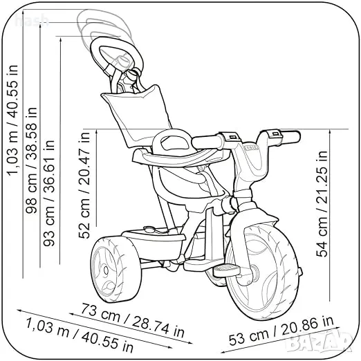- Металната конструкция прави триколката здрава. Дръжката за бутане се регулира на 3 различни височини
