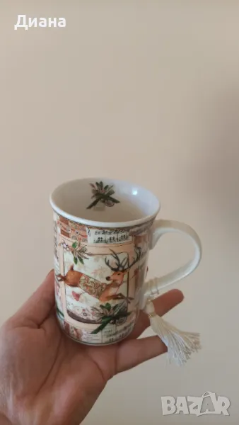 Неизползвана чаша за чай с оригинален рисунък, от луксозна Коледна серия, в златиста подаръчна кутия.