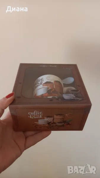 Неизползвана чаша за чай или капучино, с декорация, в комплект с лъжичка, в подаръчна кутия.