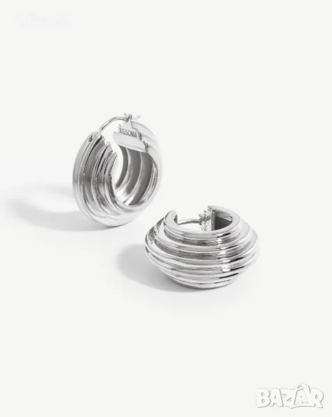 Дизайнът е с намигване към 80-те години на ХХ век. Изчистени със сребърно покритие, масивни обеци, произведени във Великобритания.