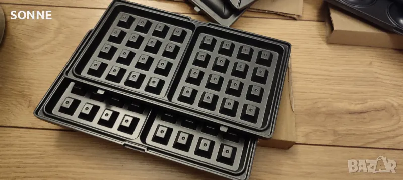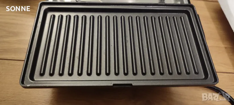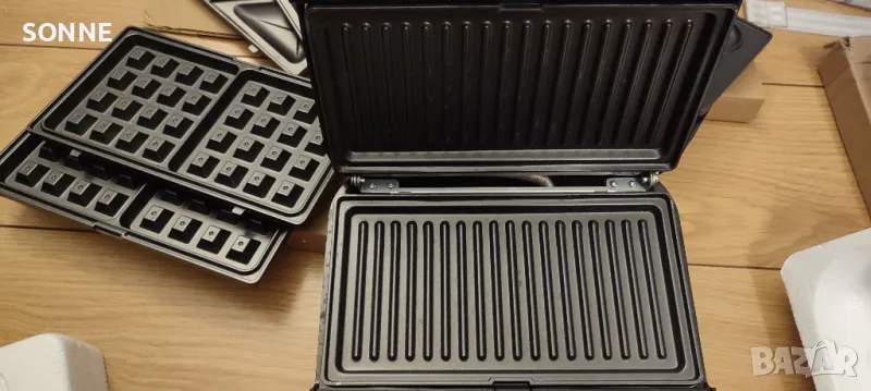 както е закупен от магазин на REWE в град Кьолн /кашон, грил, 4-ри чифта сменяеми плочи и инструкции/
