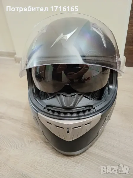 Каската е в отлично състояние, почти неразличимо от ново. Без удари или каквито и да е забележки!!! Налични затъмнени очила, които се прибират в каската от бутон.