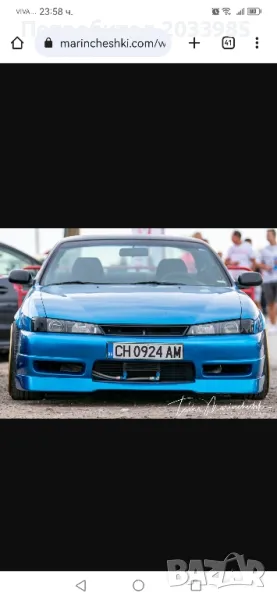 Продава се Nissan s14 Silvia 2.0 tyrbo 200 коня. Колата е Италианка, няма ръжди държи се в гараж. Имам я от 13 години, купувана от първият и собственик, като беше, като от завода. От тогава съм правил, някой неща по нея. Всичко е купувани ново през годините. Спортно окачване Д2 койловъри,съединител керамичен ATC до 700 нютона.Лек маховик алуминиев. Уреди за нялягане, на масло, температура на изгорели газове, широколентова сонда, и Буст метър всичките от най скъпата серия на АЕМ. Буст контролер на Грейси V spec електронен. Монтиран е кулер със алуминиеви тръби на 76мм. за до към 600 коня. Маслен радиатор за охлаждане със изнесен маслен филтър до фара, за лесно сменяне. Бензинов регулатор, на АЕМ. Спортен. филтър на KN конусовиден, оригинален. Генерация, от колектора на 76мм, от супра. Турбината е рециклирана, като нова във Варна преди 7 години. Маслото е сменено и винаги се кара със Motul 300V 20w60. Бензинава помпа bosh 044 оригинална. Предни спирачни апарати, от Порше Кайен 6 бутални Брембо със дискове разглобяеми, от Файтон W12 365мм. Джанти JR 32- 18 цола предни 9.5 ет 18 задни 10.5 ет 22 ако, не греша. Предната и задната, добавка към бронята са правени и раздувките по калници те по рисунка, по поръчка, праговете са, от Англия поръчвани. Колата има два компютъра единия е Стейч 1 от Англия от 260 до 290 коня, другия си стоковия 200 коня. От към интериор вътре е почти заводски вид Само със Оригинален изнесен волан Sparko двулъчов. Колата е със заводски шпер с охлаждане. Колата се кара, много рядко последно време. Не ми се рискува, да съм честен по пътя, доста я рядка, дори в момента едва ли има друга в България за продаване. Била е боядисана, от мен през годините син металик, сега зелен металик първата снимка. НЕ СЕ ДРИФТИ С НЕЯ правел съм си за кфе и изложения на съборите.
