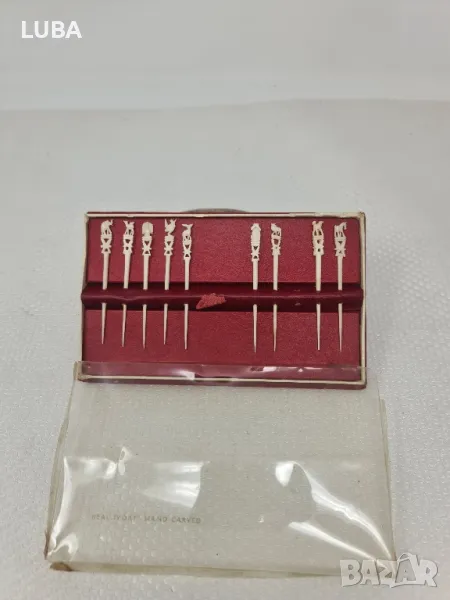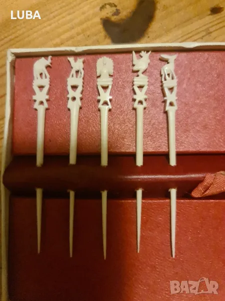 старинни ретро коктейлни пръчици от изкуствена кост с изображения на животни-ръчно резбовани