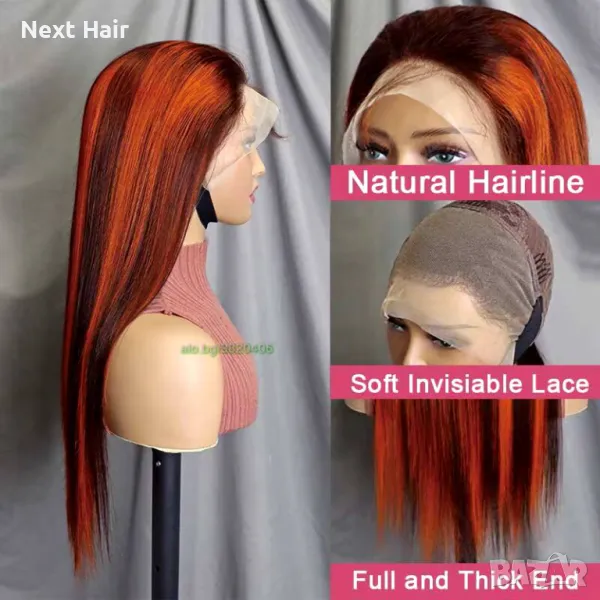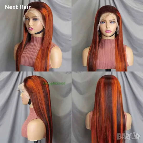 Естествена перука – кестенява с оранжеви кичури, 60 см, дантела 13х6 → Обява 48438405