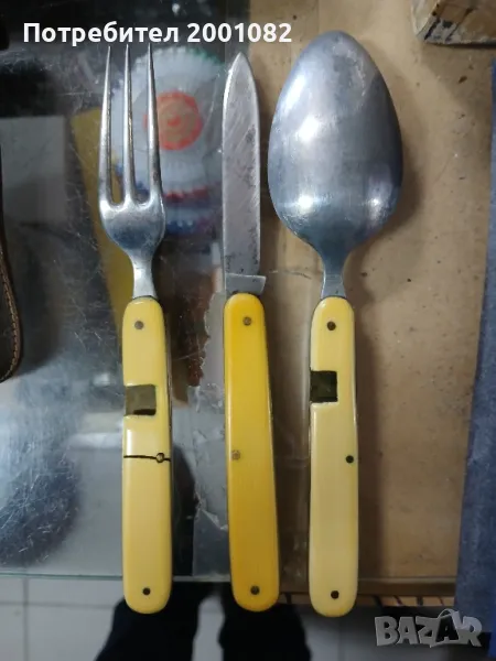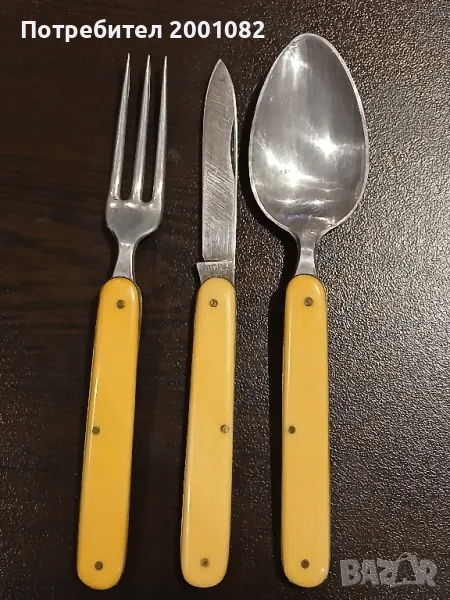 Ножа е от въглеродна стомана, а вилицата и лъжицата от алуминий.