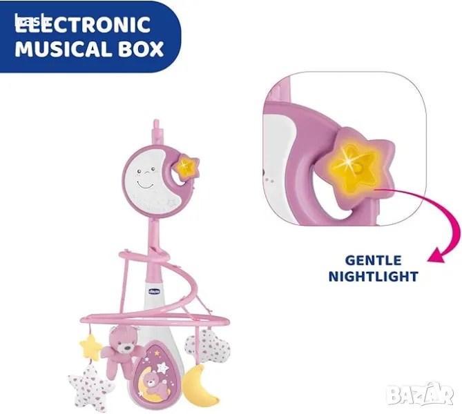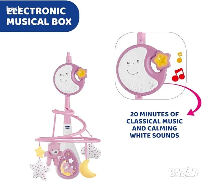 - МОБИЛ ЗА БЕБЕШКИ КОШАЛКИ И ЛЕГЛА: Мобилното устройство Next2Dreams е проектирано от Chicco като идеален партньор за бебешко креватче Next2Me, но може бързо да се монтира на повечето дървени кошари