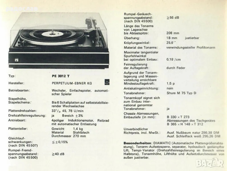 Грамофона е профилактиран и е напълно изправен. Работи като пълен автомат и в ръчен режим. Работи на 33/45 и 78 оборота. . Стерео-магнитна системаShure M75D; Честота на предаване: 20···20000 Hz..Монтирани са чинчове за изход.