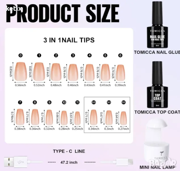 - Комплекти за нокти: мини лампа за нокти и пила за нокти. Натиснете превключвателя веднъж, UV светлината ще се включи за 60 секунди. Дръжте нокътя здраво за около 20 секунди по време на втвърдяване, за да не се изплъзне и да няма мехурчета под нокътя. Късите върхове на ноктите TOMICCA са предварително боядисани с розов/телесен цвят. Можете да го стилизирате директно върху ноктите и да се насладите на забавлението от маникюра „направи си сам“!