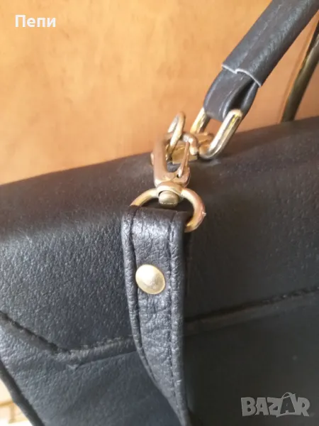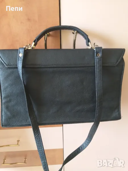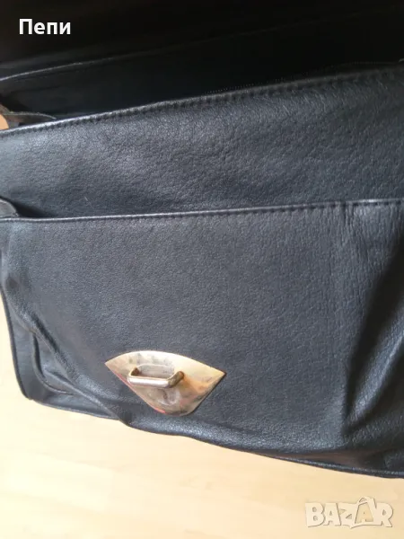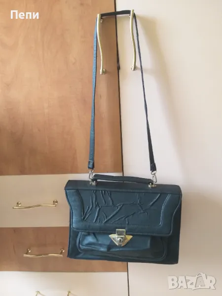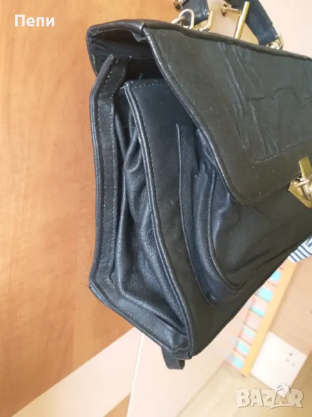 Дамска чанта от свинска напа с малка дръжка и дълга, която може да се сваля. Купувана от СБХ. Разм.на чантата 34/24/10 см. Дъното е 10 см. Има 2 прегради, като в средата преградата е голяма с цип. На капака има намачкан ефект. Българско производство.