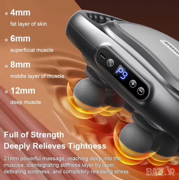 Пистолетът за ударен масаж може да нанася удари 19000 пъти в секунда, дълбочината на амплитудата е 20 мм,