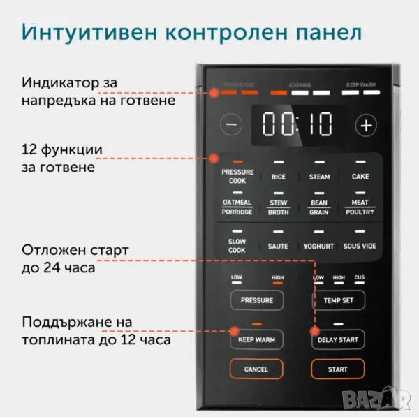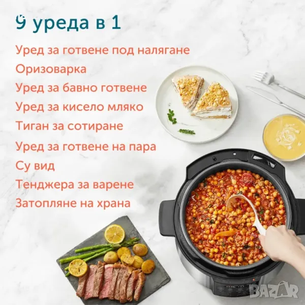 Получавате 9 уреда в 1, уред за готвене под налягане, оризоварка, уред за бавно готвене, уред за приготвяне на кисело мляко, тиган за сотиране, уред за готвене на пара, су вид, тенджера за варене и уред за затопляне на храна.