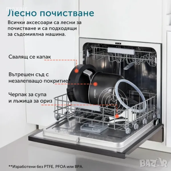 Основният съд, капакът както и всички аксесоари са лесни за почистване и са подходящи за съдомиялна машина.