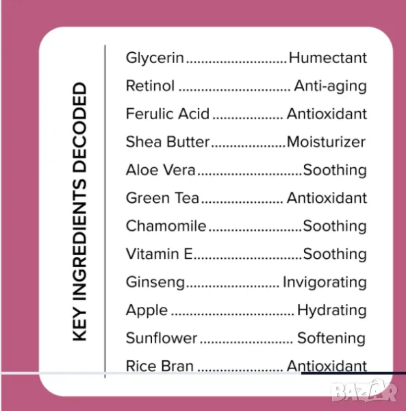 Възстановяващ възрастта крем - Ретинол + ферулова киселина, снимка 1 - Козметика за тяло - 48442353 Възстановяващ възрастта крем - Ретинол + ферулова киселина, снимка 2 - Козметика за тяло - 48442353 Възстановяващ възрастта крем - Ретинол + ферулова киселина, снимка 3 - Козметика за тяло - 48442353 Възстановяващ възрастта крем - Ретинол + ферулова киселина, снимка 4 - Козметика за тяло - 48442353 1/4