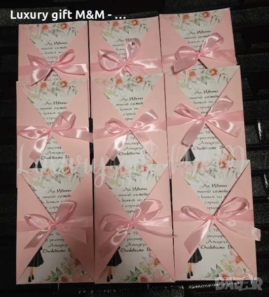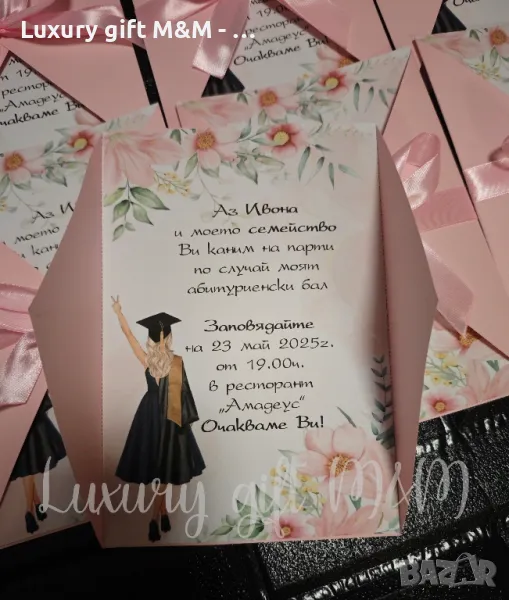 Покани за абитуриентски балове.Изработена от плътен картон 160гр. Дизайна и цвета може да бъде по ваша идея. Текста също. Цената включва текста.Цена 1,40
