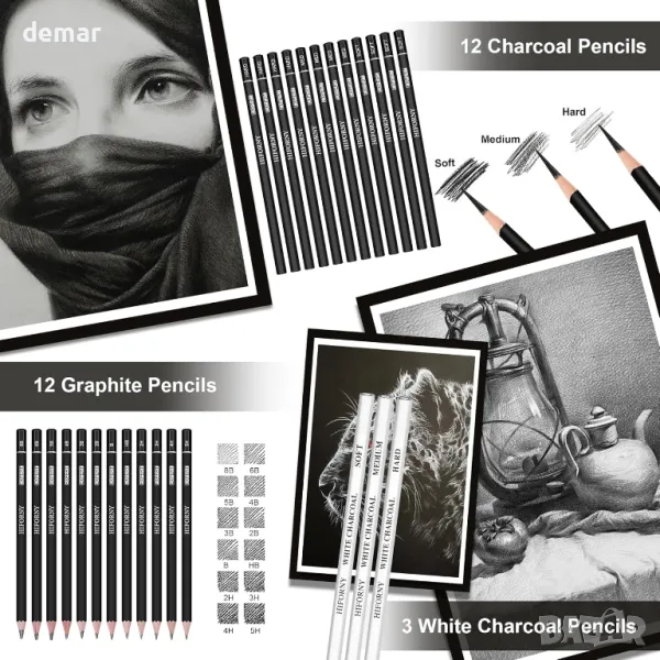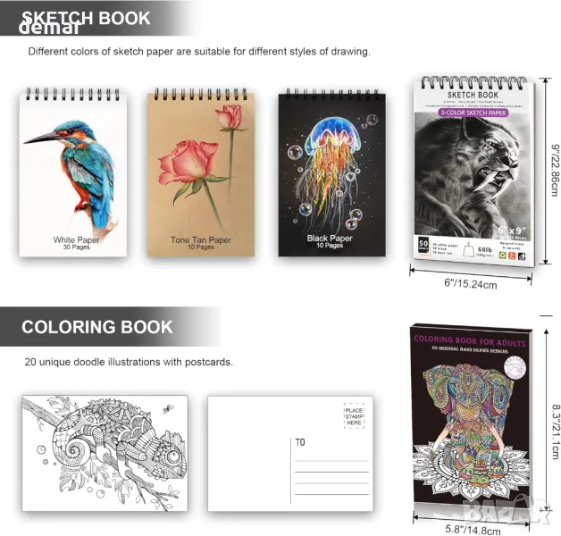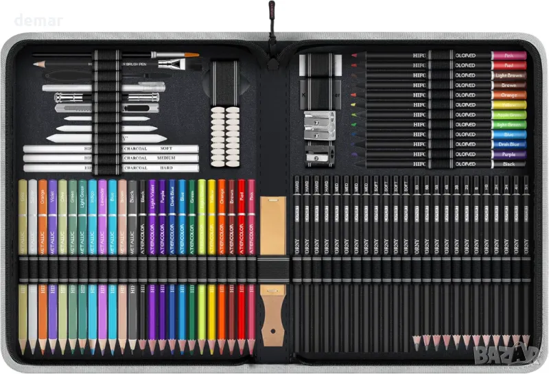 Арт комплектът от 100 части включва разнообразие от професионални моливи за различни стилове на рисуване, като въглен, графит, черно издание, акварел, металик и други, всички ясно маркирани за лесна употреба. Предлага се с основни аксесоари като пънове за смесване, гуми, острилки, нож и комплект за скициране. Комплектът включва уникален скицник с бели, светлокафяви и черни страници, плюс книга за оцветяване с първокласни илюстрации в стил пощенска картичка. Предварително подострените моливи предлагат гладки, издръжливи върхове за засенчване, преливане и живо оцветяване. Преносимият, водоустойчив калъф поддържа доставките организирани за пътуване или употреба на открито. Този многофункционален комплект е идеален за художници, студенти и любители, което го прави подходящ подарък за различни поводи.