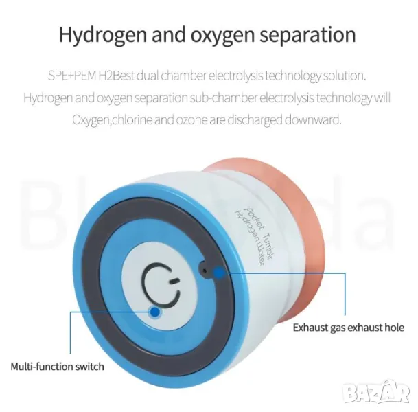 * 100% безопасен за пиене, чистотата на водорода достига 99,99%. Кислородът, хлорът и озонът се отделят и се изпускат от долното устройство за отвеждане на отпадните газове.