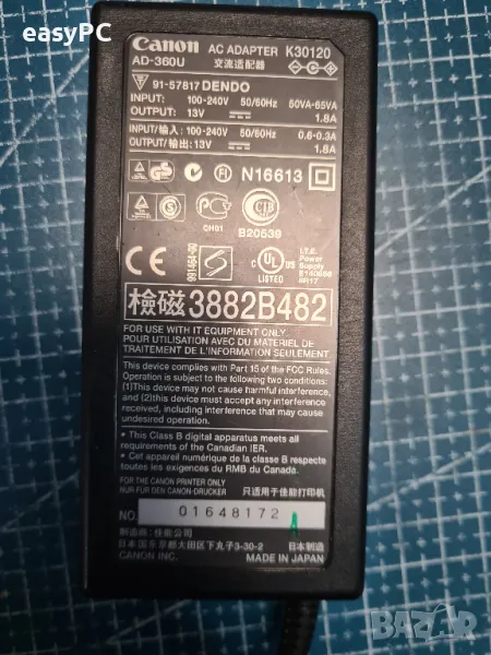 Продавам оригинален захранващ адаптер CANON AD-360U 13V 1.8A. Адаптера е употребяван, но е напълно функционален и работи.