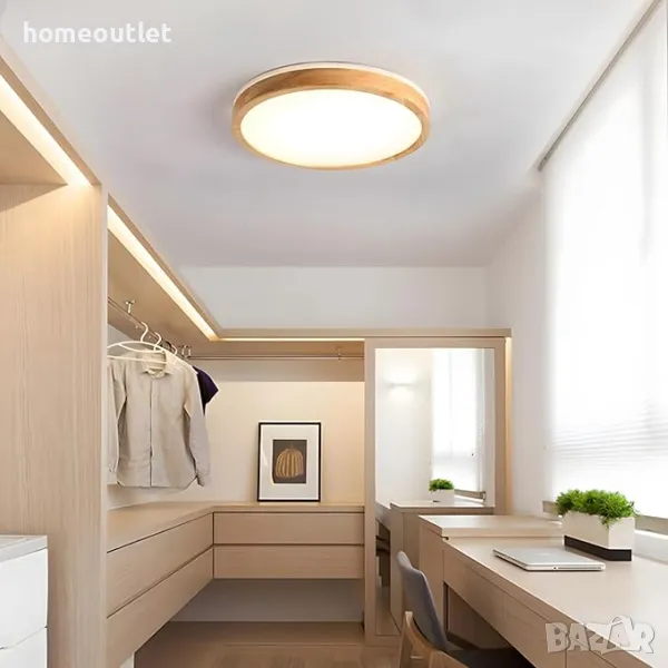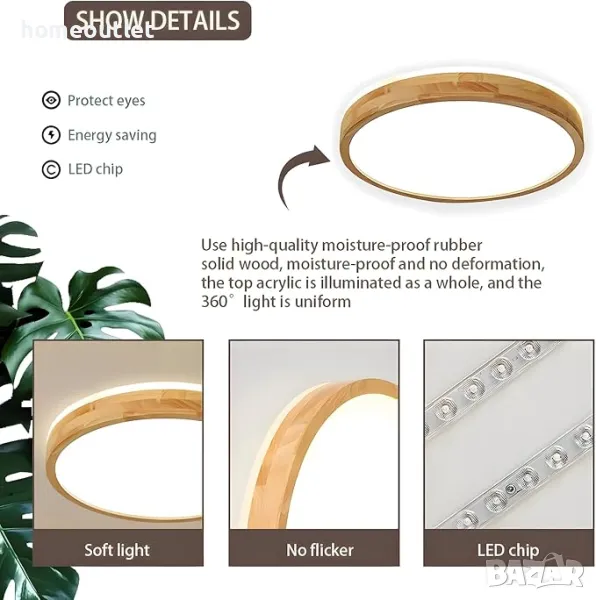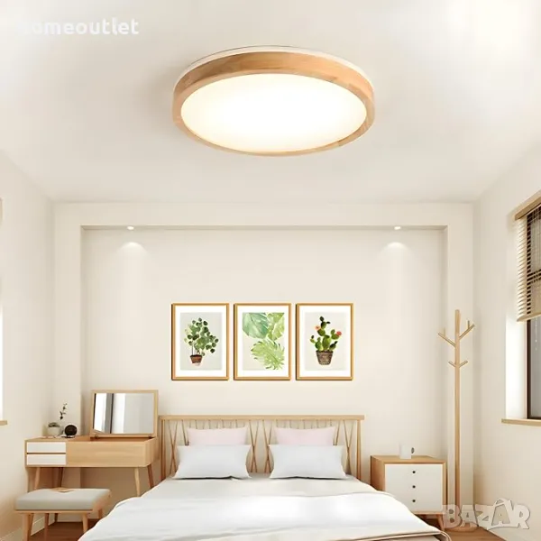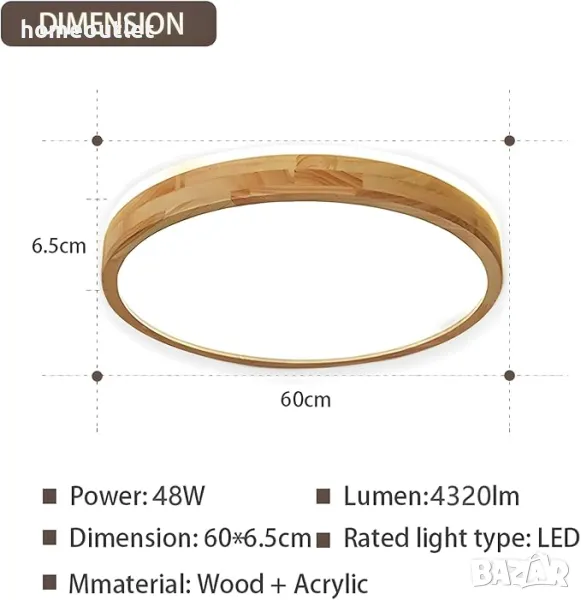 Кръглата дървена таванна лампа с повърхност от масивно дърво е лъскава, с еднакъв цвят, ясна текстура, а акрилният абажур има добро предаване на светлина.