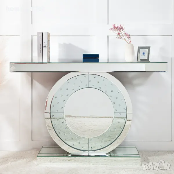 С огледално покритие и искрящи кристали, вградени в кръглата стъклена средна рамка.