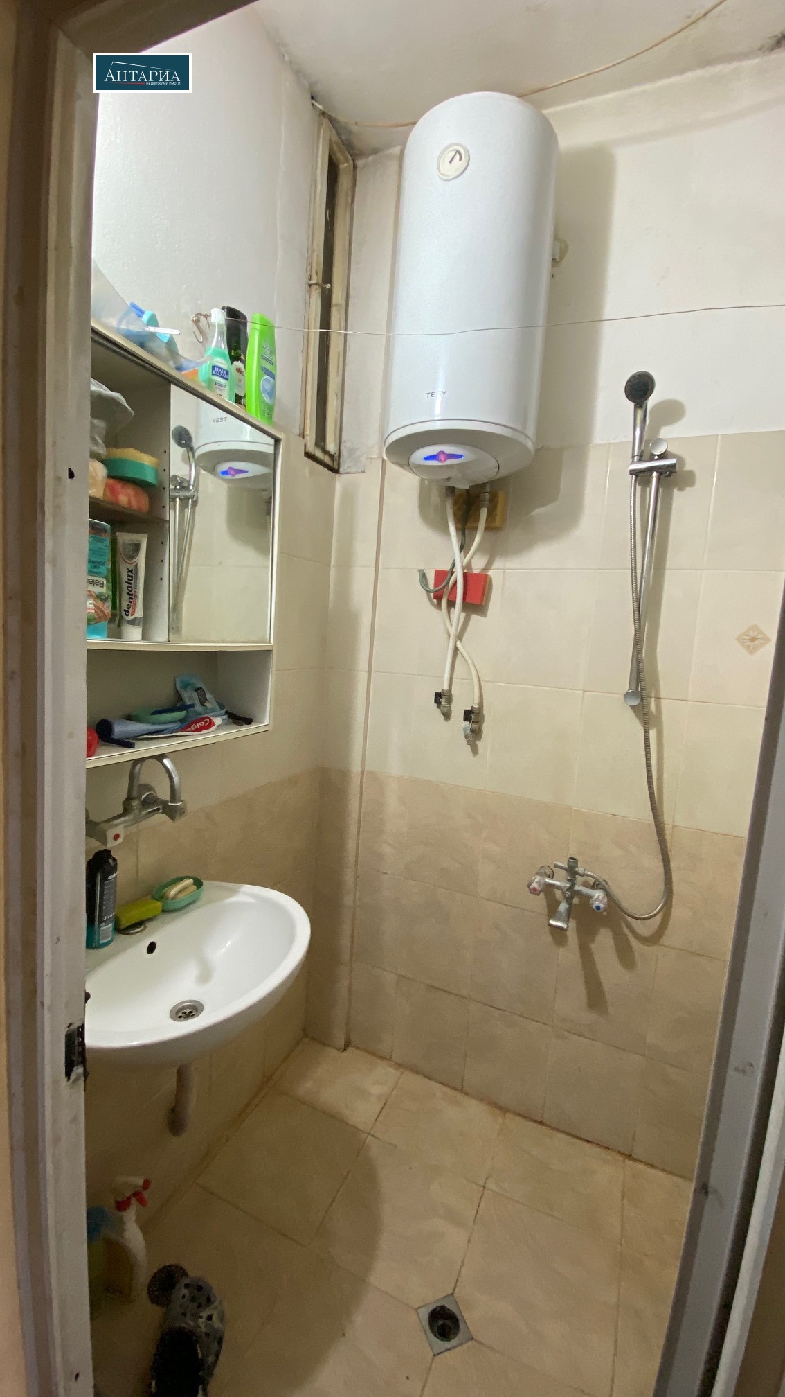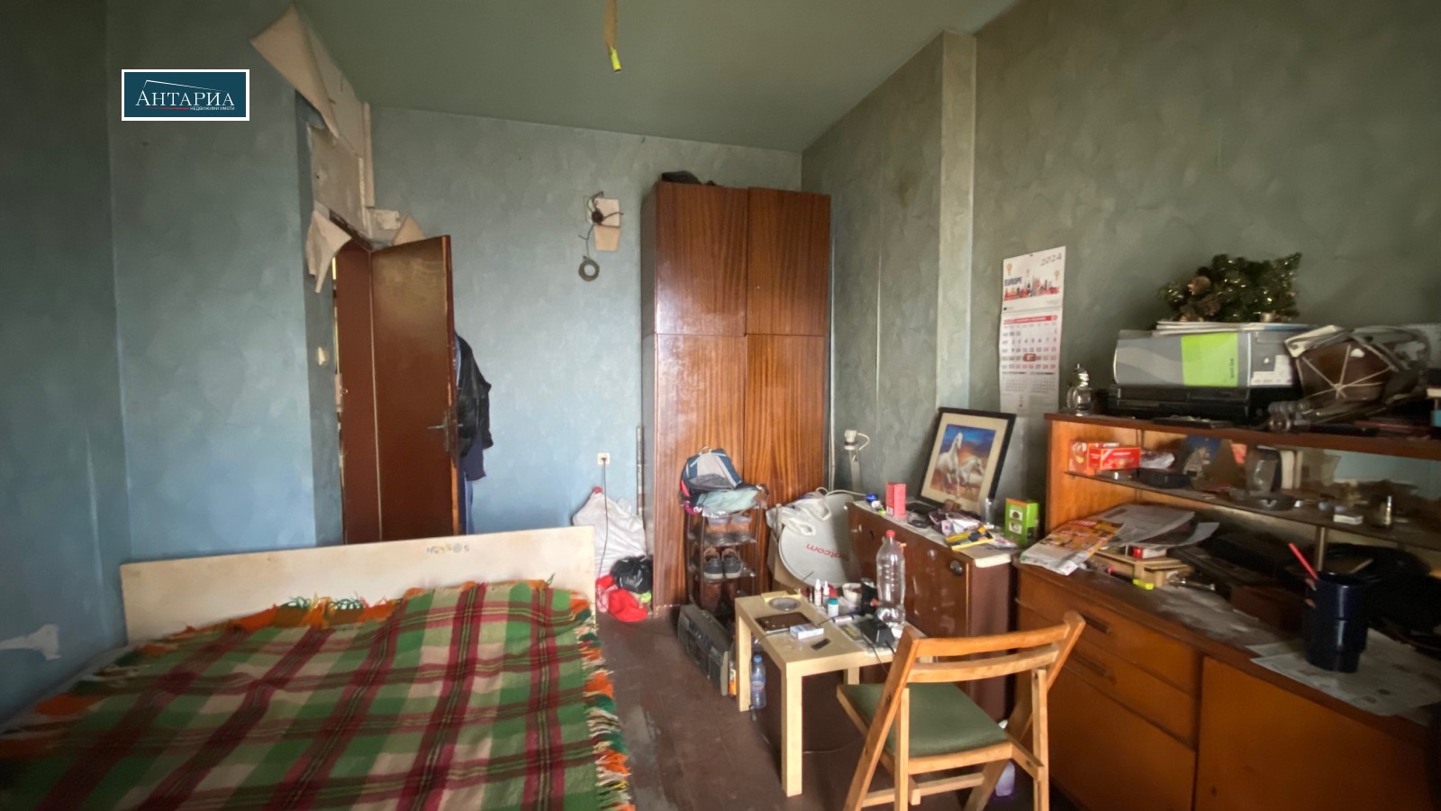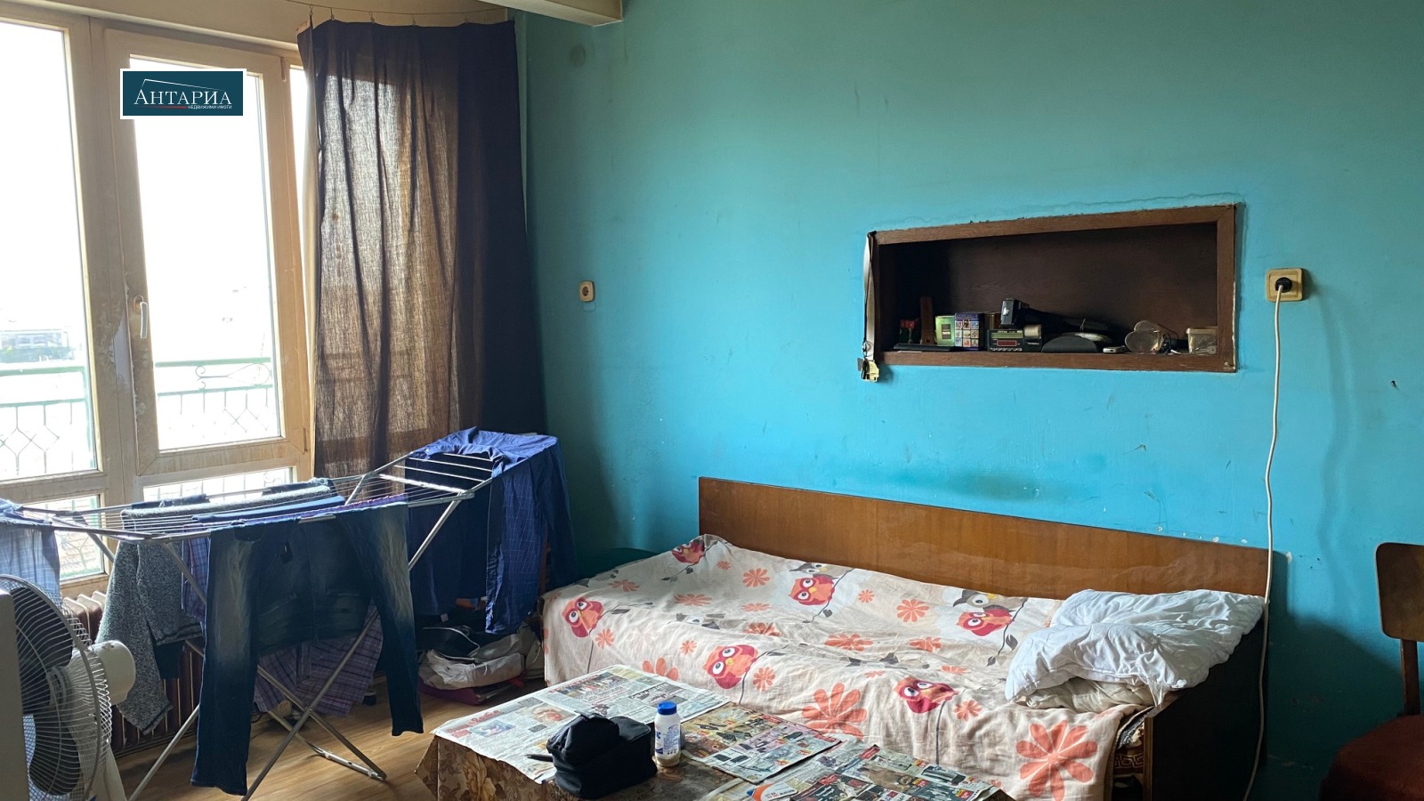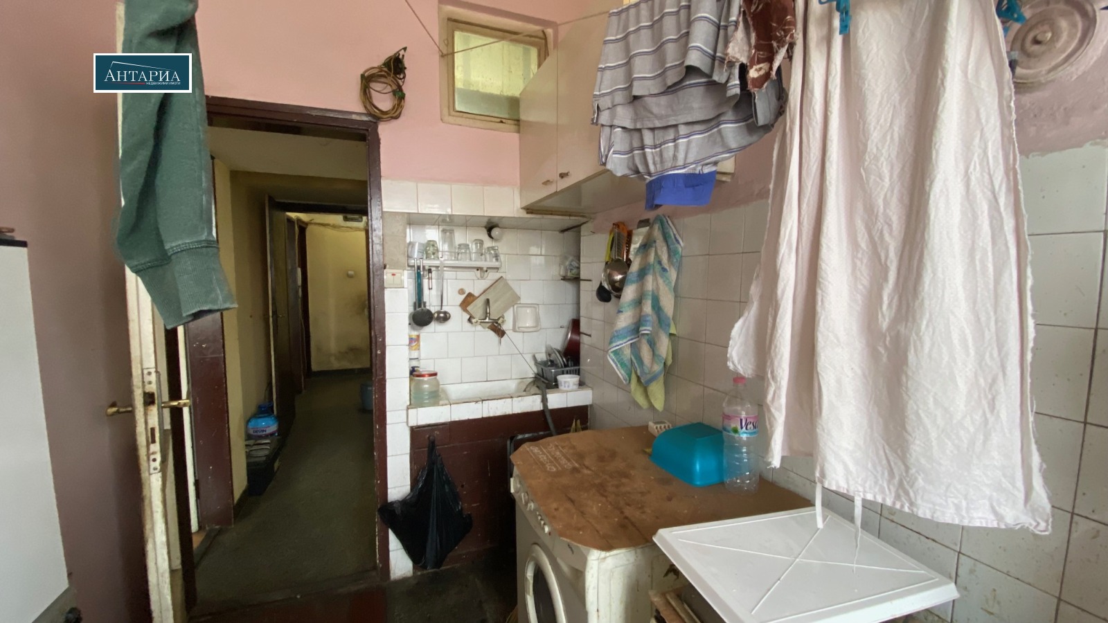 Апартаментът е на пети етаж (над партер), разпределението включва коридор, хол с вестибюл, кухня, самостоятелна спалня, баня, тоалетна и балкон пред спалнята. Изложенията са изток и запад, апартаментът е с хубави изгледи и в двете посоки. Сградата е без централно отопление. Жилището е за ремонт. Към имота има прилежащи мазе(3 кв.м. и таванско помещение (3 кв.м.), също и собственост върху дворното място в ид.ч.