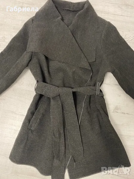 Топло зимно палто в тъмносив цвят, с колан в талията. Размер по етикет XL, но става за дами размер S и M, модела го позволява. Дължина измерена от рамо 74см.