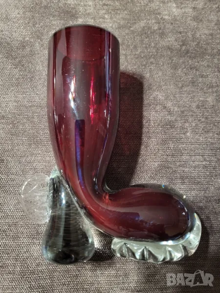 Малка вазичка от червено стъкло, във формата на коледен ботуш.