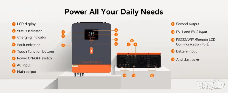 Инверторното зарядно устройство предлага гъвкаво персонализиране на мощността, с 3 режима на зареждане (Само слънчева енергия, Първо електрическа енергия или Слънчева енергия и енергия) и 2 режима на изход (Първо слънчева енергия, Първо електрическа енергия). Персонализирайте захранването към предпочитания от вас източник. В режим на соларен приоритет, инверторът максимизира използването на слънчевата енергия чрез интелигентно превключване между захранване и батерия въз основа на зададена точка на напрежение на батерията.
