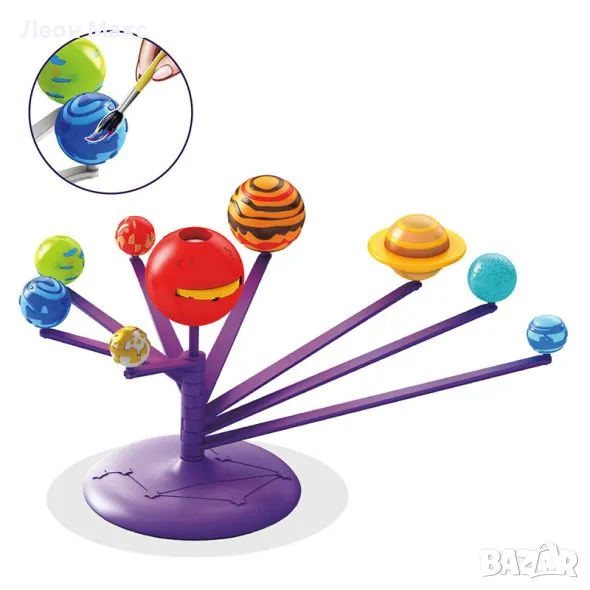 След като оцветите, сглобете стойката и подредете всички планети и Слънцето по показаната схема (вижте снимките на продукта за повече информация).