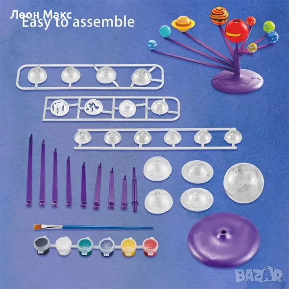 В комплекта ще откриете 8 планети и Слънцето, които трябва да сглобите и оцветите с включената четка и боички.
