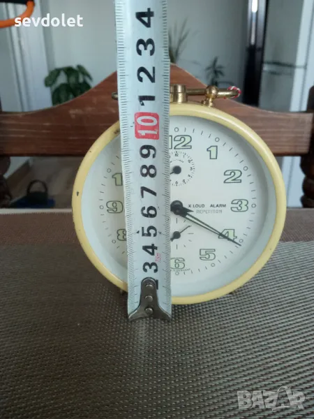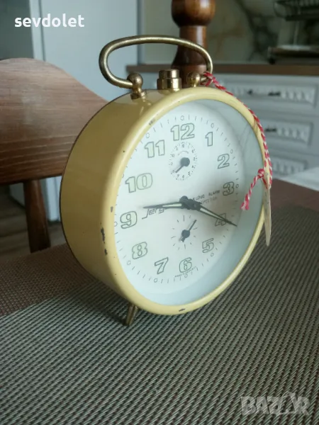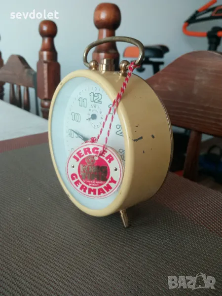 Часовник-будилник.Произход-Ф.Р.Германия-90те години на миналия век.Работещ(и то много точно).С малки забележки.С етикети на продажната цена през годините на миналия век.