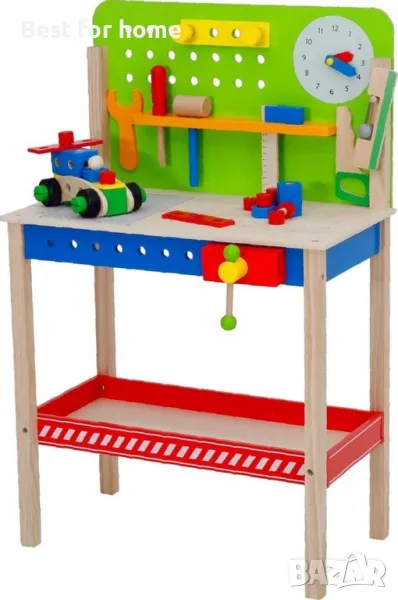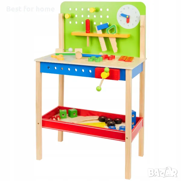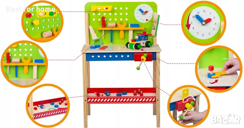 Работната маса има часовник с подвижни стрелки, който ви позволява да се научите как да определяте часа, докато играете. Снабден е с подвижно менгеме, което помага за задържането на елементите по време на работа, както и със закачалка за инструменти и долен рафт за аксесоари, което ви позволява да поддържате ред, докато играете.