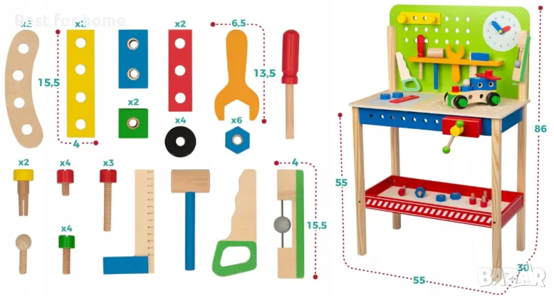 Комплектът съдържа цели 40 дървени елемента, включително работна маса и 6 инструмента, като чук, отвертка, дори нивелир и други, които позволяват на децата да творят и конструират. Елементите на комплекта като дъски, блокове, колела, винтове и гайки ви позволяват креативно да изграждате различни структури и проекти. Детето може да построи кола от тези елементи с помощта на винтовете и инструментите от комплекта.