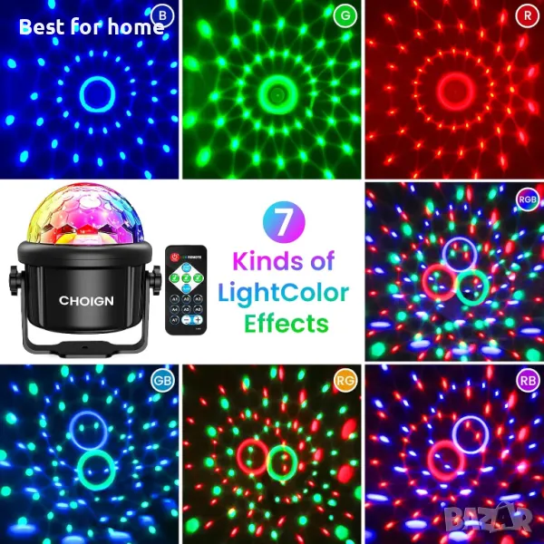【Режими на осветление】3 режима, активирани със звук + 7 режима на осветление + управление на скоростта на въртене; Светлините мигат в ритъма на музиката в режим на активиране на звука. Можете също така да регулирате цветовете според вашето настроение и тема на партито.