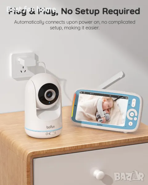 Монитор с бебешка камера BOIFUN VB805, 5-инчов 720P IPS пълноцветен екран, без Wi-Fi, нощно виждане, 360° камера, режим VOX, 2-посочно аудио, 3050 mAh батерия, напомняне за хранене, температурен сензор, приспивни песни, обхват 1000 фута