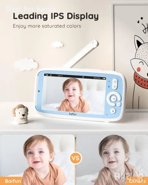 [5-инчов HD IPS дисплей]: Бебефонът на Boifun разполага с ново поколение IPS екранна технология с висока разделителна способност. В сравнение с традиционните LCD екрани, той не само увеличава продължителността на живота, но също така значително подобрява точността на цветовете и яснотата на изображението. Без значение от кой ъгъл гледате, можете да се насладите на отличен цвят и контраст, гарантирайки, че можете да наблюдавате бебето си с най-високо ниво на детайлност.