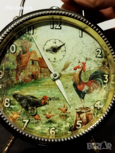 Стар английски рядък анимиран будилник Smiths.Работи и звъни, смазан и профилактиране, в отлично за годините състояние.Диаметър отзад-125 милиметра