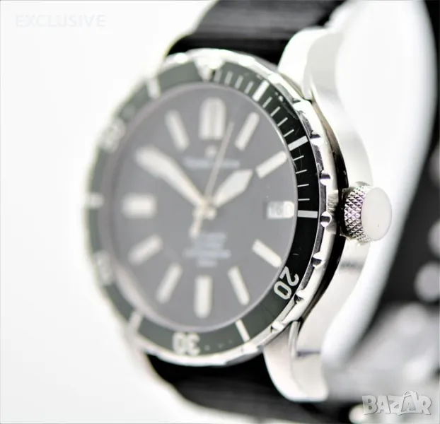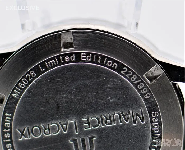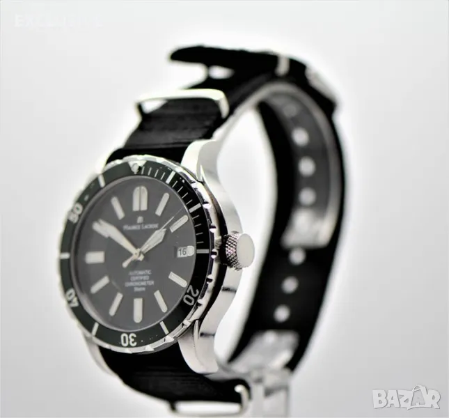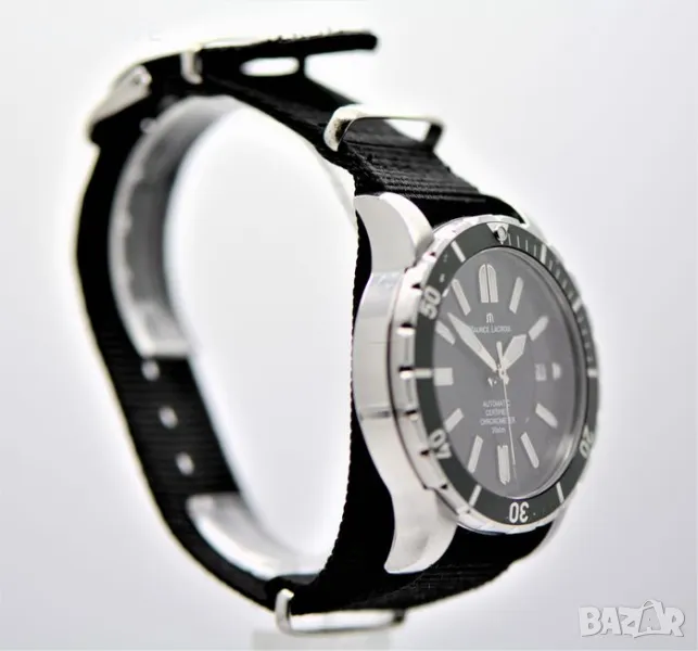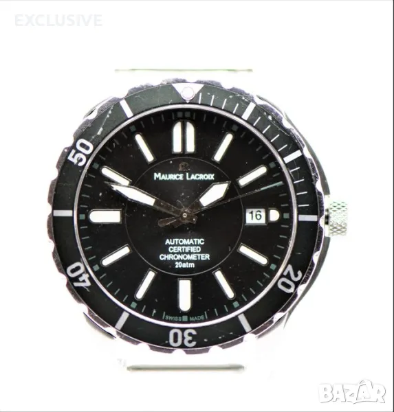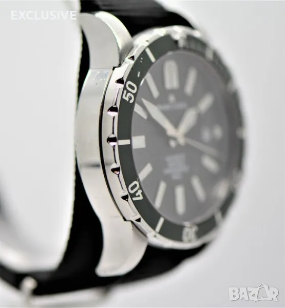 Maurice Lacroix Miros Diver Chronometer limited Мирос - ограничено издание 228/999 Справка: Реф. MI6028 Корпус на часовника: Неръждаема стомана, Диаметър прибл. 41 mm, Височина прибл. 11,8 mm, Водоустойчив до 20 atm/като нов, но в момента не е гарантиран/Сапфирено стъкло, Завийте короната и гърба Часовников механизъм-функции: Автоматично, часове, минути, секунди, дата Циферблат: Черен циферблат с тъмно зелена рамка/ в момента не се продава никъде с такъв/ светещи стрелки и маркери Каишка: Черна платнена каишка за часовник Дължина на лентата до 200 мм Характеристики: Ограничени до 999 артикула, това е номер 228!!! Тегло: 84,7 грама Хронометър устройство: Носен часовник/ имаше 1 година гаранция при закупуване от бижутер на часовникар, но не е носен за колекция! Препоръчителна цена на дребно от 05. 2010 г.: 1395.00 евро