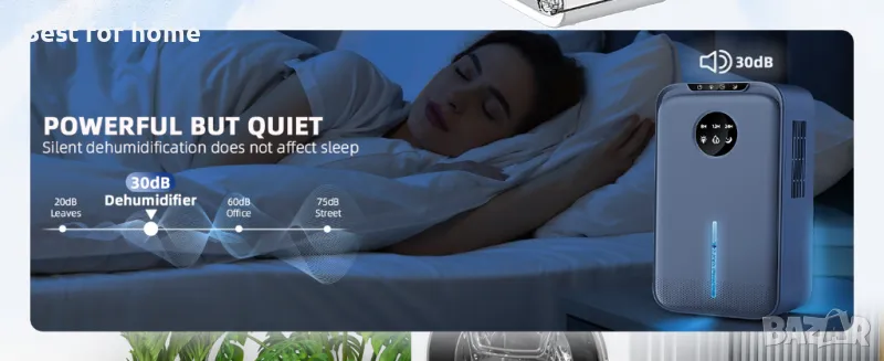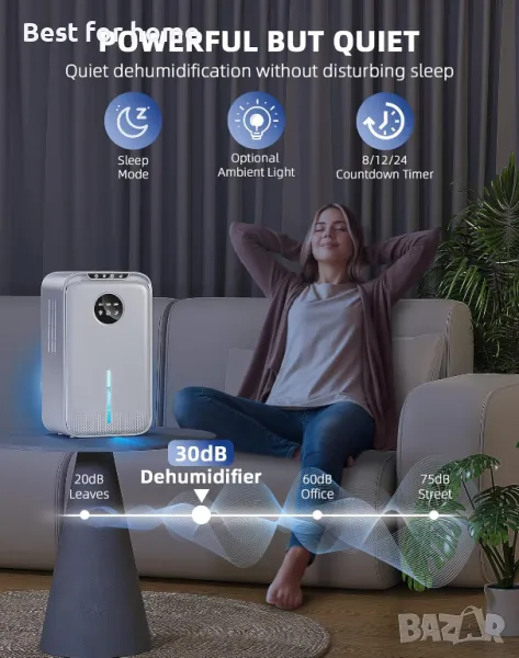 Спокоен сън: влагоуловителя използва усъвършенствана технология на Пелтие, която може да намали работния шум, без да засяга ефективността на изсушаване. Просто пуснете влагоуловител за една нощ, за да поддържате здравословна влажност в стаята си. Дневният режим ефективно намалява влажността и също така има режим на заспиване с ниска скорост, който работи тихо (<30 dB), докато спите.