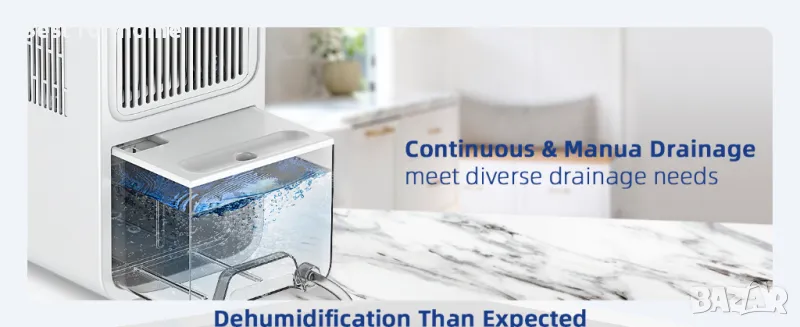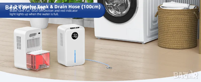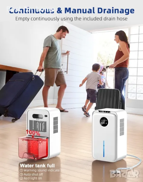 Автоматика: Електрическият влагоуловител има видим резервоар за вода с капацитет 2,2 литра и може да се изпразва постоянно чрез дренажен маркуч. Когато нивото на водата е високо или резервоарът за вода бъде изваден, влагоуловителя автоматично се изключва и светва червена светлина, за да запомни. С опцията 8/12/24-часов таймер можете да настроите кога обезвлажняването да се изключва автоматично.