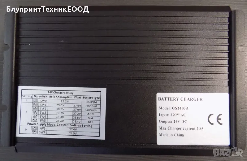 Това е импулсно зарядно устройство, което зарежда със постоянен ток от 10А. Процеса протича във един или три етапа (bulk, absorption, float), в зависимост от избрания режим от осем възможни. Те са: LiFePo4, с течен електролит обслужваем, калциев, AGM, необслужваем, GEL, постоянен 24.0V, постоянен 27.6V. Избора на режим се осъществява посредством триполюсно двупозиционно DIP ключе, разположено на предния панел. Различните комбинации са посочени в упътването, както и на стикер залепен на гърба на устройството. Охлаждането се управлява от термодатчици командващи вентилатора. Номиналните 10А са реални, и зарядното ги поддържа стабилно без ограничение в продължителността на зарядния процес. Има защита от прегряване, размяна на полюсите, късо съединение, високо напрежение, ниско напрежение и свръх ток. При шест от режимите, след завършване на зарядния процес, устройството поддържа батерията в режим подзаряд. Разполага с бутон "WAKE UP" за събуждане на литиева батерия в случай че BMS-a и е изключил аварийно поради ниско ниво на заряд в клетките.