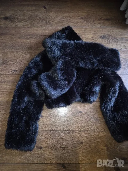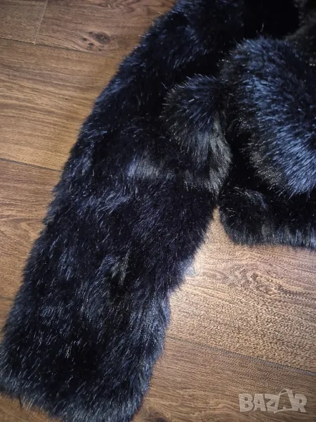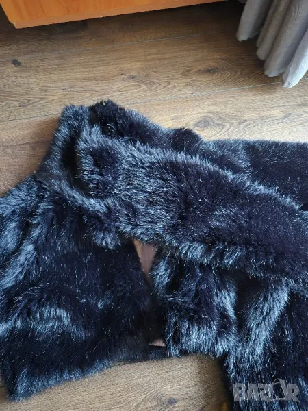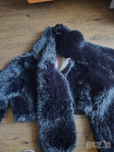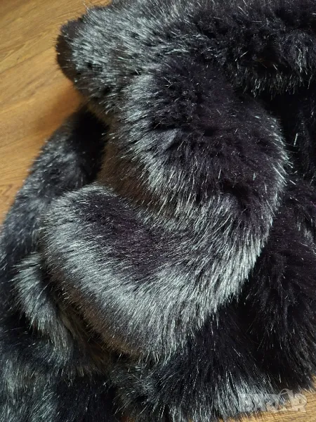 Късо с пресмятане на яката,като шал.Косъма наподобява истински.