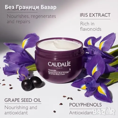 Стягащ крем за тяло с мощни активни съставки: масло от гроздови семки, био ший, полифеноли и ирис.