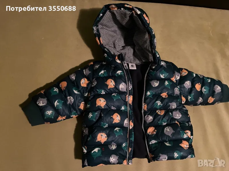 Яке Petit Bateau за момче, размер 18м, настояща цена 237лв. Качулка, закопчаване с цип отпред, изработено от микрофлийс, за да държи топло, но да не спарва.